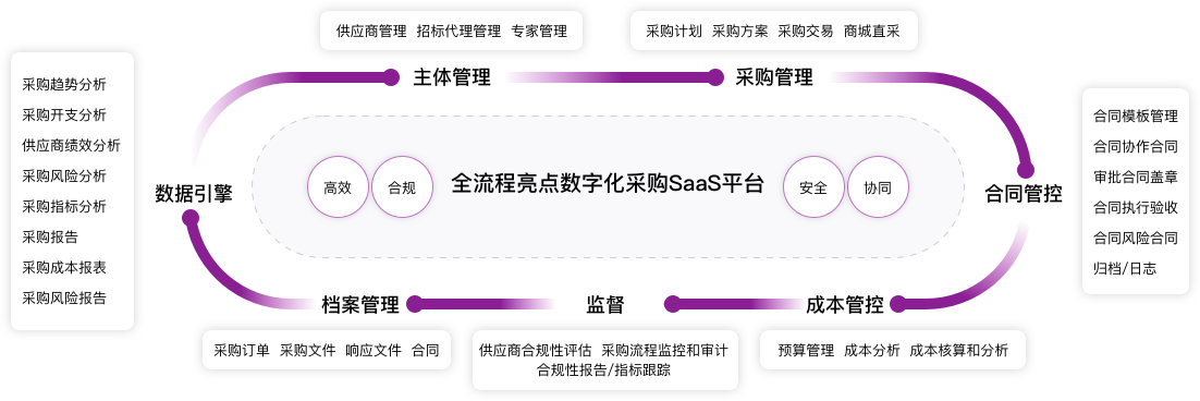 实现外部供应商准入、寻源、执行、结算全过程协同;内部采购、法务、质量、仓库、财务全角色协作。